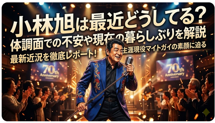 こんにちは!昭和太郎です。昭和の時代、映画が全盛期の頃日本中の銀幕を席巻した、マイトガイこと小林旭さん。2026年3月現在87歳という年齢を迎えておられます。「最近はどうされているの?」「体調は大丈夫なの?」とその近況を心配するファンの声が多く聴かれます。2004年には転倒による骨折というアクシデントがありましたが、小林さんは不屈の精神でこれを克服し見事に復帰されました。現在はYouTubeでの発信や、デビュー70週年を記念した大規模なコンサートなど、驚くほど精力的な活動を続けているのです。本記事では小林旭さんの最新の体調や、YouTubeで見せる素顔、そして「生涯現役」を貫く現在の暮らしぶりについて出来るだけ詳しく解説します。今もなお熱き心を燃やし続ける、スターの現在地を私と一緒に見て行きましょう。